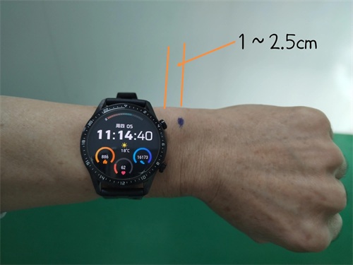 2.将手表佩戴在腕骨以上(往手臂方向),手表表盘外侧距黑点约1~2.5cm处,这就是正确的位置,见下图:
