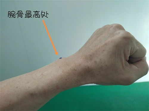 1.首先找出你的腕骨的位置,图中黑点突起最高处就是腕骨的位置,如下图: