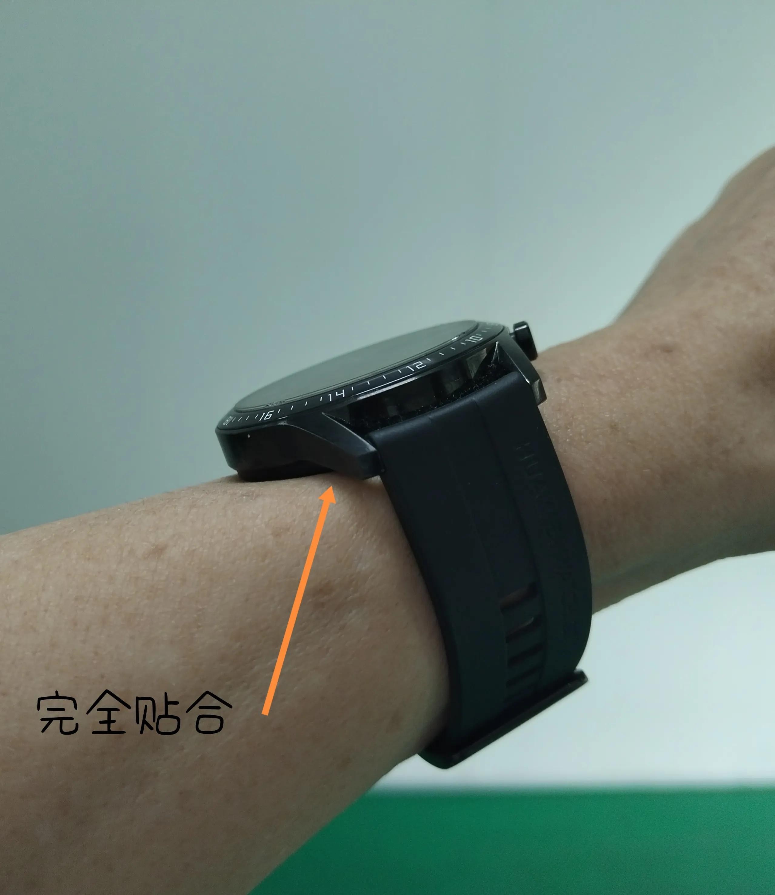 3.扣紧表带,手表底部与手腕皮肤完全贴合,且能保证手表在运动过程中不上下滑动,这就是松紧适宜,见下图: