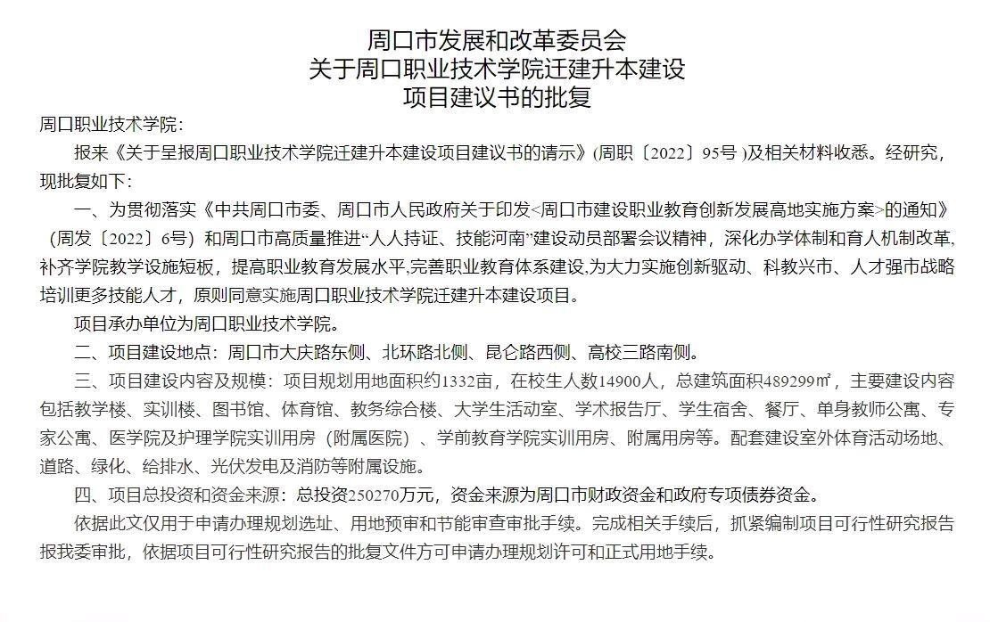 近日,周口市发改委发布了周口职业技术学院“迁建升本”建设项目的批复,该项目地处市大庆路以东,昆仑路以西,高校三路以南和北环路以北,规划占地面积1332亩,投资250270万元,规划在校生14900人。很明显,就是当地官方很支持该校的“升本”工作,所以才实实在在的划地给学校。