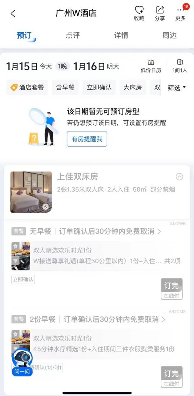 在携程平台上搜索广州 W 酒店,则显示今日(15 日)起所有房型均 " 已订完 "。