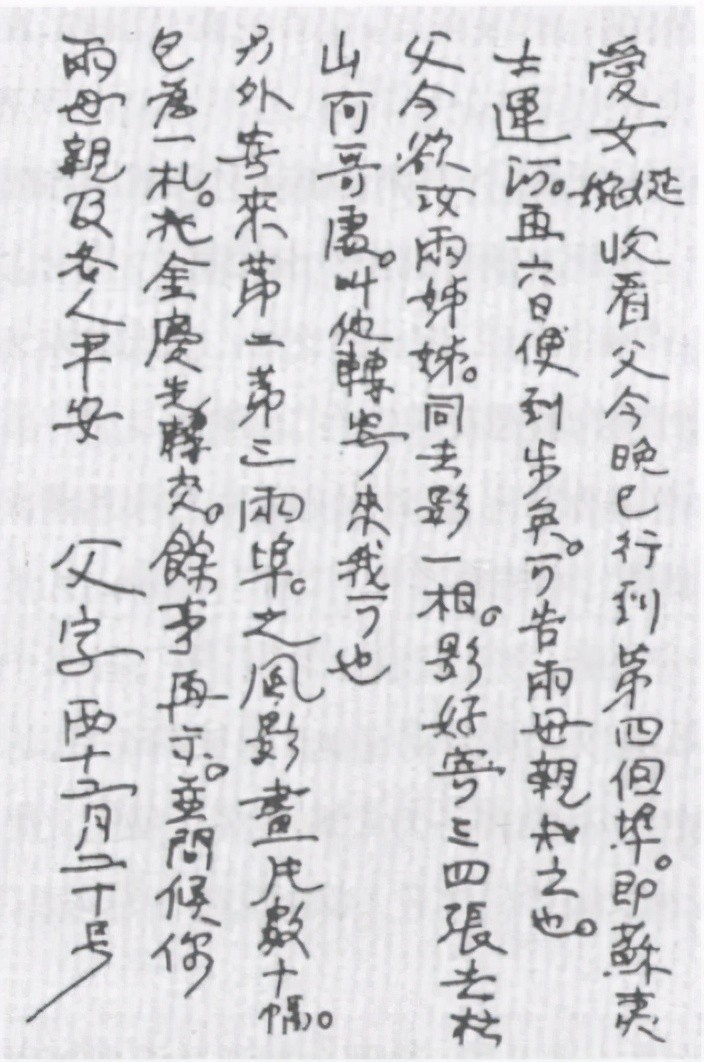 “爱女娫婉收看:父今晚已行到第四个埠。即苏伊士运河。再六日便到步(埠)矣。可告两母亲知之也。……余事再示。并问候你两母亲及各人平安。——父字西十二月二十号”
