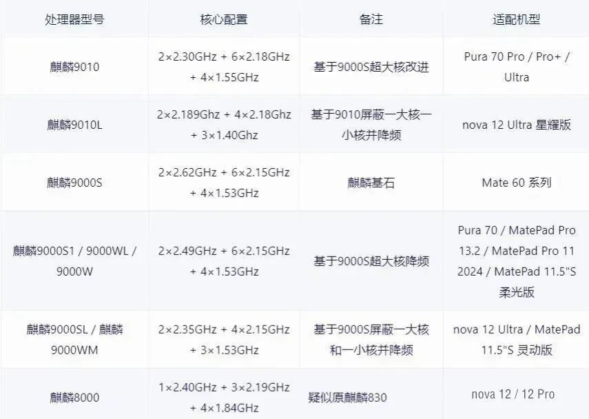麒麟9010>9000S>9000S1>9010L>9000SL