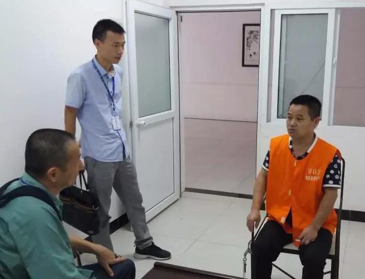 笔者在看守所采访逃犯李银保,站立者为办案民警何鹏程
