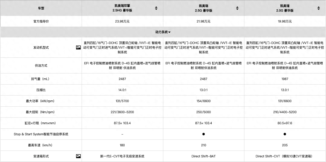 以丰田的凯美瑞举例。凯美瑞2.5L燃油发动机和2.5L双擎发动机,虽然两者都是2.5L的发动机,在动力参数和表现上却相差甚远。