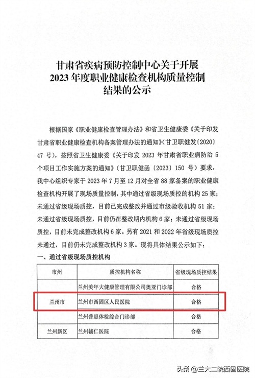 近日,兰州市西固区人民医院在2023年度职业健康检查机构现场质量控制评审中成功通过考核,认证为兰州市职业健康检查机构质量控制单位,该项荣誉是对我院职业健康检查工作的肯定与认可,也是我院为体检者提供更优质健康服务的有力保障。