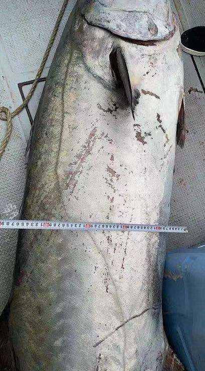 经现场测量,该鱼体长为2.2米,宽0.45米,体重高达210斤。