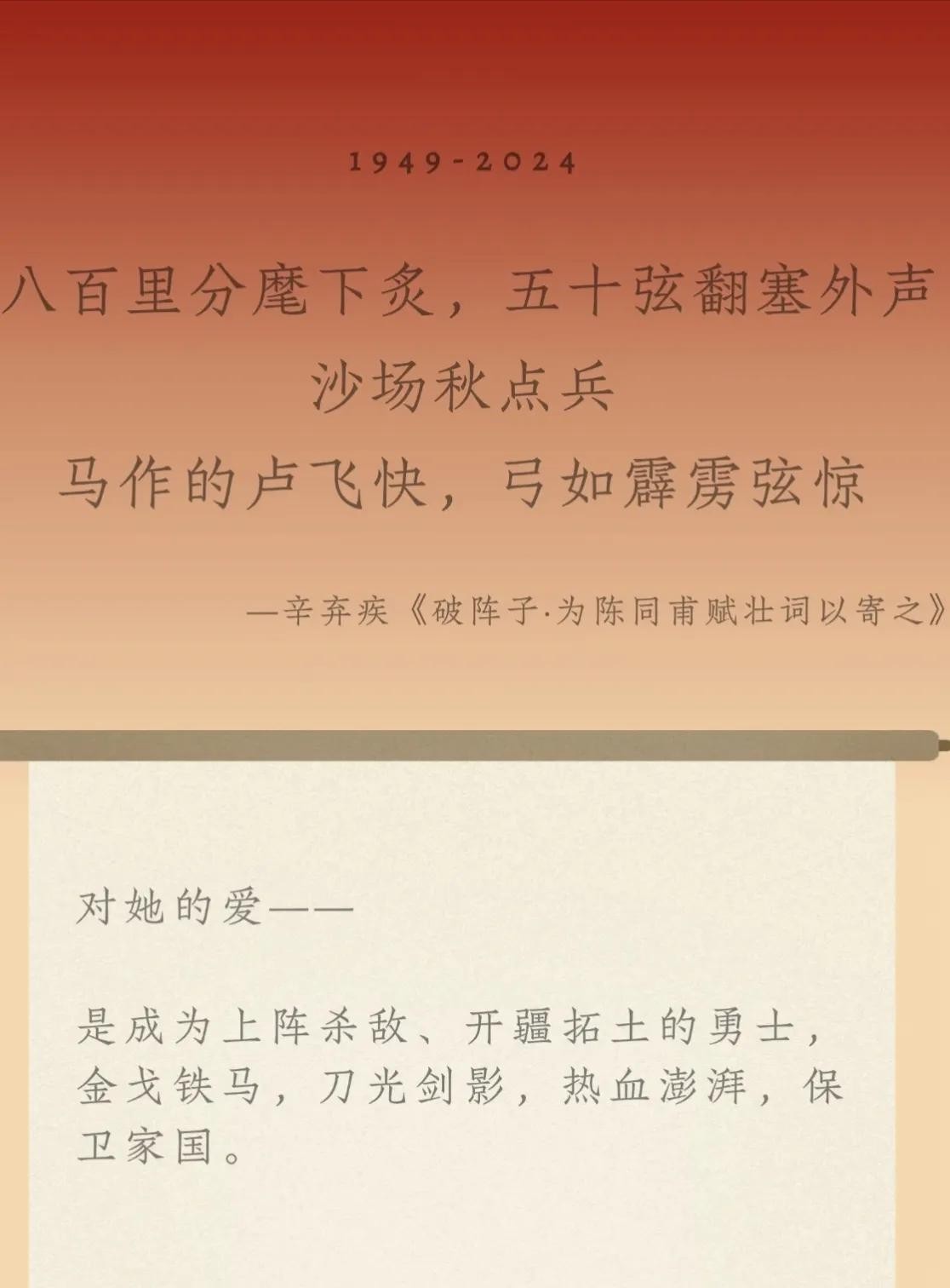 还有“僵卧孤村不自哀,尚思为国戍轮台。”哪怕身处困境,仍心系国家,这种深沉的爱国之情,在国庆的氛围中显得愈发浓烈。