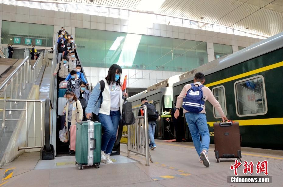 4月13日,山东首趟复学专列K4046次从济南发出,900余名石河子大学学生分别从济南站、石家庄北站搭乘由中国铁路济南局担当的全卧铺专列,踏上复学路。中新社记者 郝学娟 摄