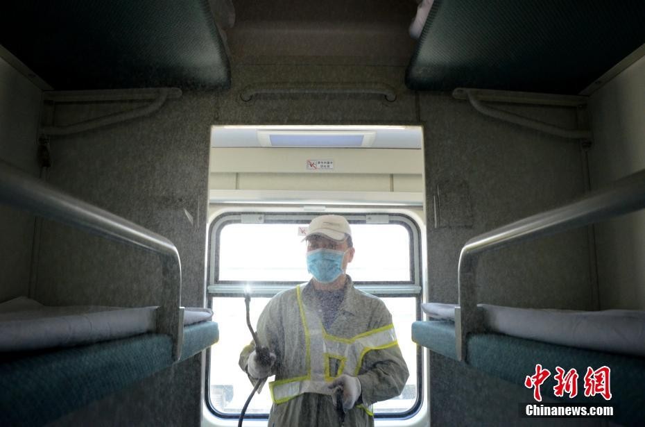 4月13日,乘务人员对K4046次列车的卧铺爬梯、茶水炉、门把手、座位等列车公共区域进行统一集中消毒,并对洗手台水龙头、厕所等重点部位加大消毒力度。山东首趟复学专列K4046次当日从济南发出,900余名石河子大学学生分别从济南站、石家庄北站搭乘由中国铁路济南局担当的全卧铺专列,踏上复学路。中新社记者 郝学娟 摄