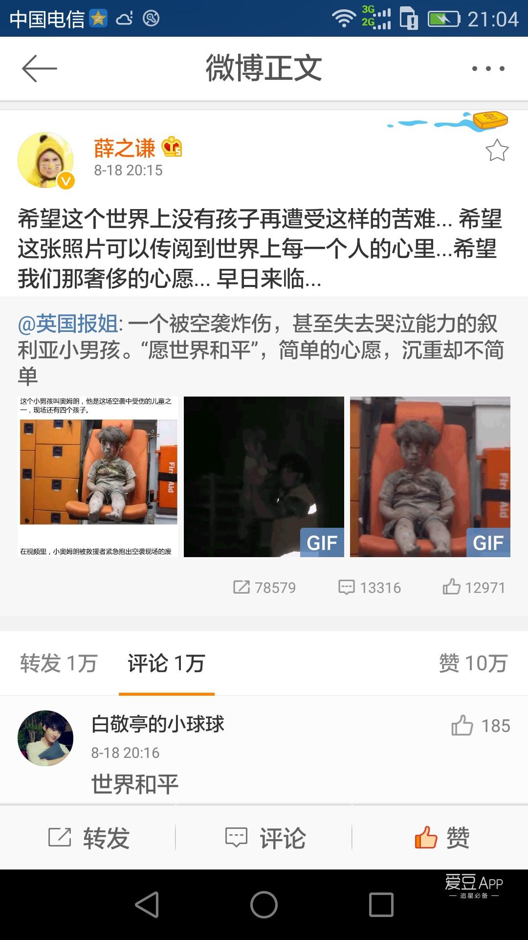 8月18日晚20:00左右,薛之谦在微博转发了一则新闻:“战乱国家发生了空袭,许多十二岁以下的孩子受了重伤,送往救助站救治。”这让我们不禁感叹,谦谦的一句“世界和平”,却其实没有那么容易。小编真心希望可以停止战争,不让更多的孩子饱受战乱之苦。谦谦转发时配文:“希望这个世界上没有孩子再遭受这样的苦难……希望这张照片可以传阅到世界上每一个人的心里……希望我们那奢侈的心愿……早日来临……”是啊,希望我们那奢侈的心愿,早日实现吧!