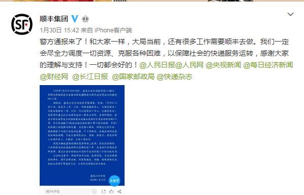 1月30日,顺丰官微通报说:大局当前,还有很多工作需要顺丰去做。我们一定会尽全力调度一切资源、克服各种困难,以保障社会的快递服务运转。