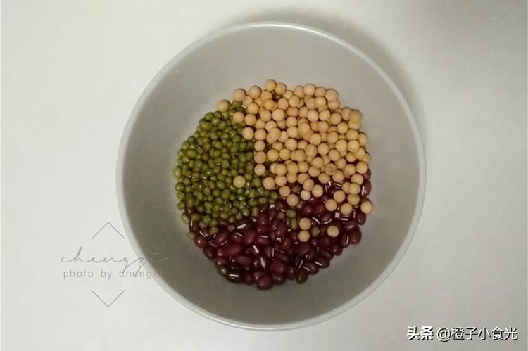 所用食材:黄豆25克,红豆25克,绿豆25克,核桃20克,花生15克,纯净水约900毫升
