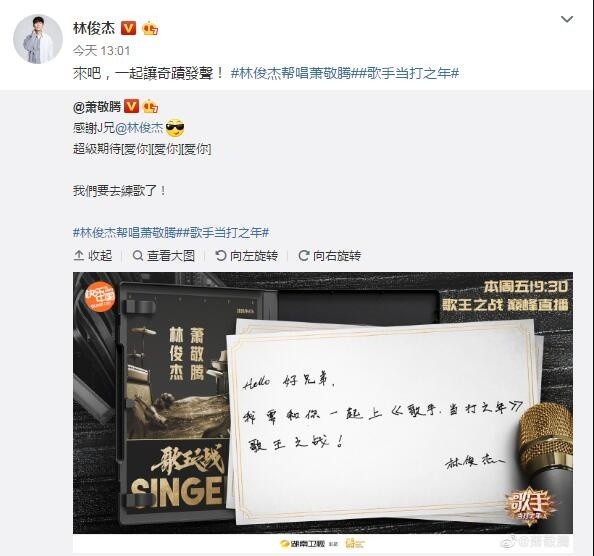不久前,由林俊杰亲笔写的“我要和你一起上《歌手·当打之年》歌王之战!”通过官宣形式告知大家,如今两位“当事人”的互动更令人期待两个人在舞台上的合作。