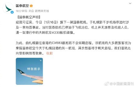 @国泰航空 发布声明称,经我司证实,今日(1月16日)旗下一架国泰航机,于札幌新千岁机场停泊时涉及一宗地面事故。当时国泰航机已停泊于飞机泊位,机上并无旅客及机组人员,遭一架滑行中的大韩航空A330航机碰撞。