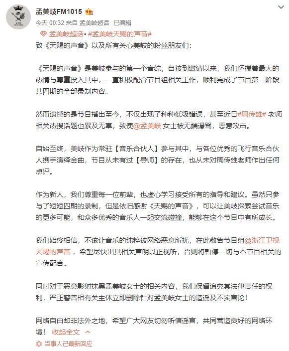 紧接着,孟美岐方也做出回应,表示她是做为长驻“音乐合伙人”并非“老师”参加综艺节目,也从没对周传雄教师做出一切评价。并且要求栏目组尽快出具相关声明以正视听,否则将暂停一切与本节目相关的宣传配合。