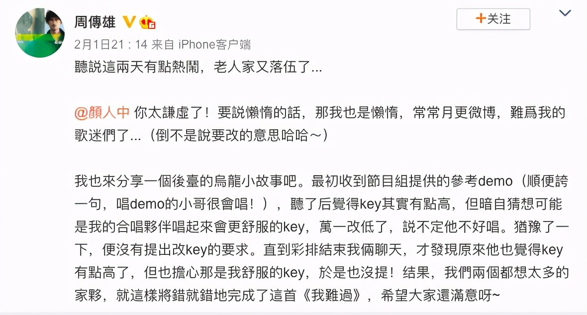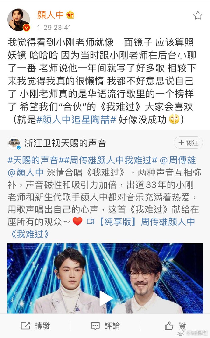 在这个事件中,和周传雄合唱的颜人中首先发布了一条状态,表示小刚老师就像是一面镜子,是华语流行歌里的榜样。
