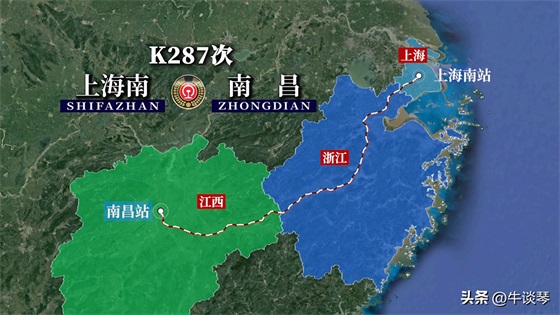 K287次列车运行线路图:上海南开往江西南昌,全程817公里