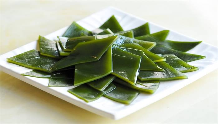 4、看海带表面颜色是否正常,正常颜色深黑,厚度均匀,有白霜。颜色发黄的较老,水发后不易煮烂。