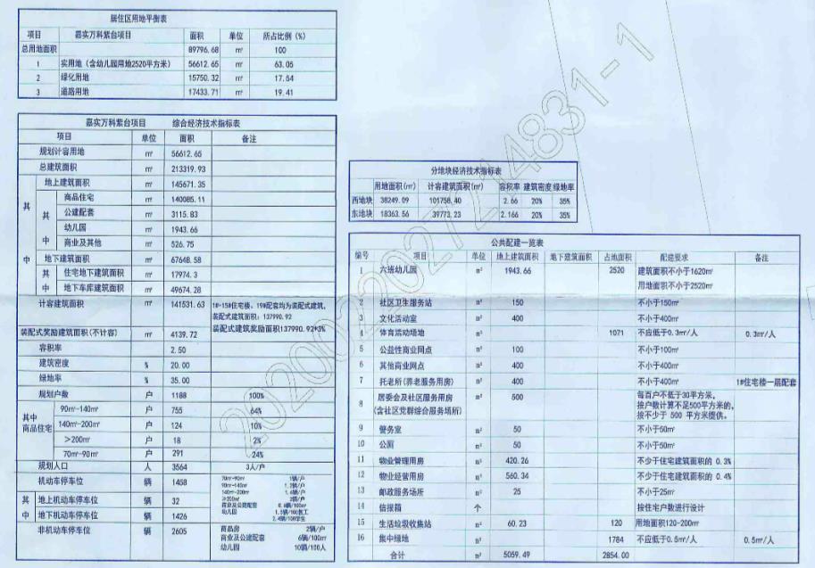 项目总规划建筑面积213319.93平方米,地上建筑面积145671.35平方米,地下建筑面积67648.85平方米,其中1-15#、19#配套楼均为「装配式建筑」,装配式建筑总面积为137990.92平方米,按照相关规定按照装配式面积3%予以面积奖励且不计容,奖励面积为4139.72平方米。该项目容积率为2.5,建筑密度为20%,绿地率为30%,规划户数1188户,其中其中商品住宅90-140平方米755户,140-200平方米124户,200平方米以上18户,70-90平方米291户,地上机动车停车位32辆,地下机动车停车位1426辆。