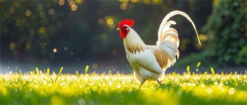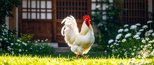 这句描绘的是:公鸡身披洁白的羽毛,自信地向我们走来。
