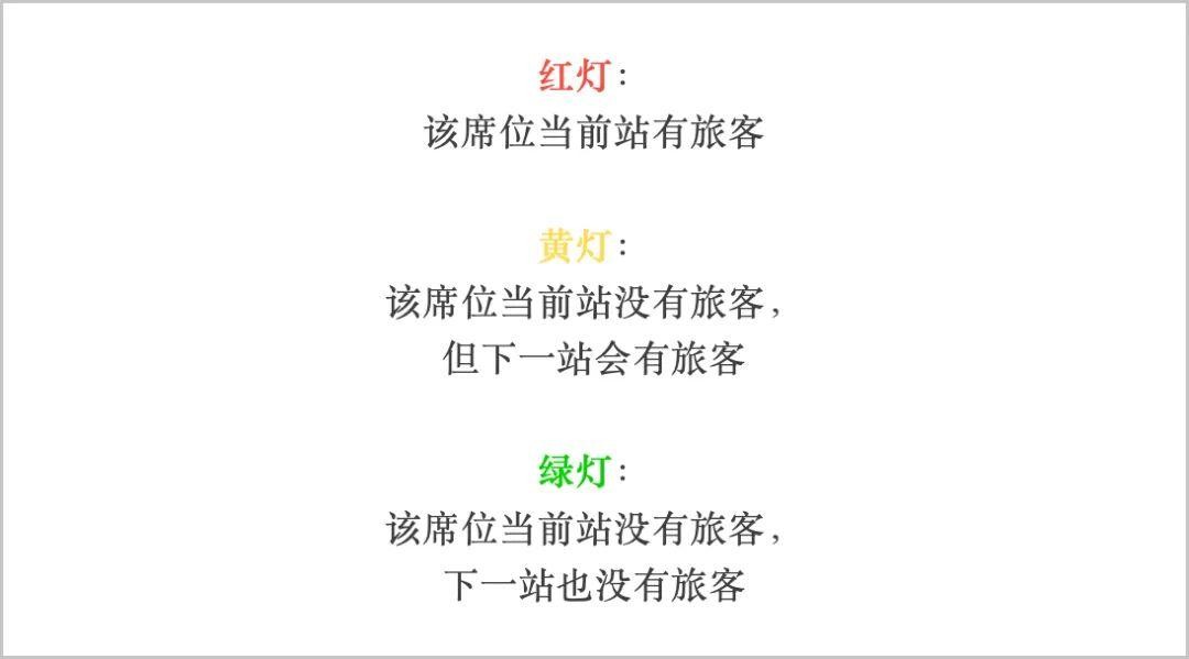 根据中国铁路集团,高铁座位上方的指示灯代表着座位的使用情况。