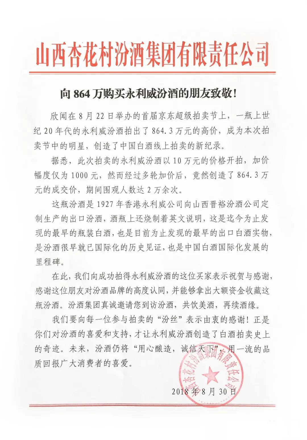 2025年8月22日的首届京东超级拍卖节上,一瓶永利威汾酒以864.3万元的成交价再次刷新了拍卖纪录。