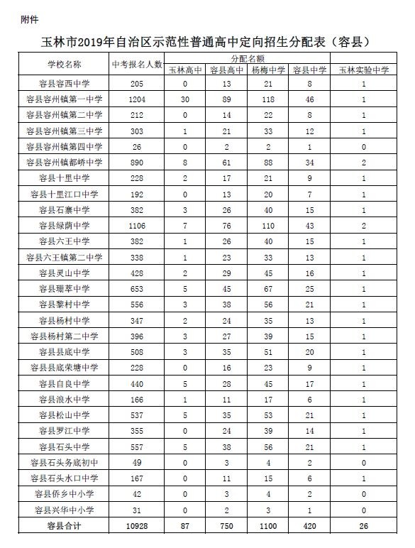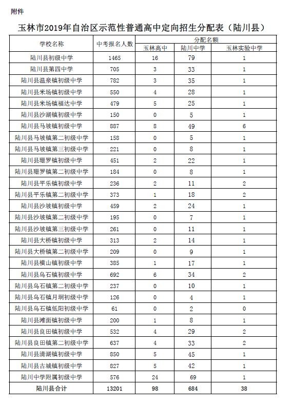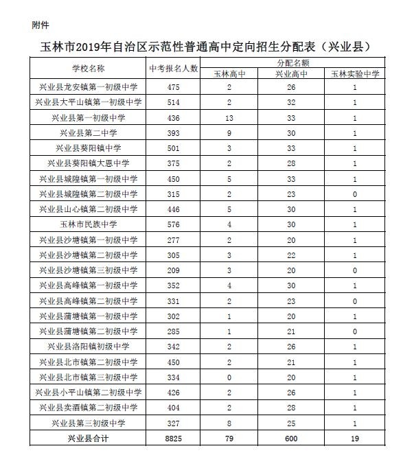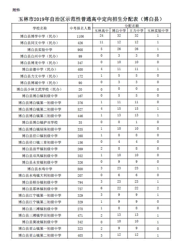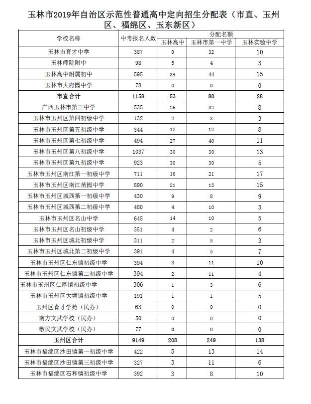 根据自治区招生任务,2019年玉林全市普通高中计划招生50100人,比2018年(48020人)增加2080人,其中全市11所自治区示范性普通高中计划招生16250人,一般公办普通高中计划招生24740人,一般民办普通高中计划招生9110人;市直计划招生11270人、北流市计划招生11480人、容县计划招生5480人、陆川县计划招生6620人、博白县计划招生11500人、兴业县计划招生3750人。