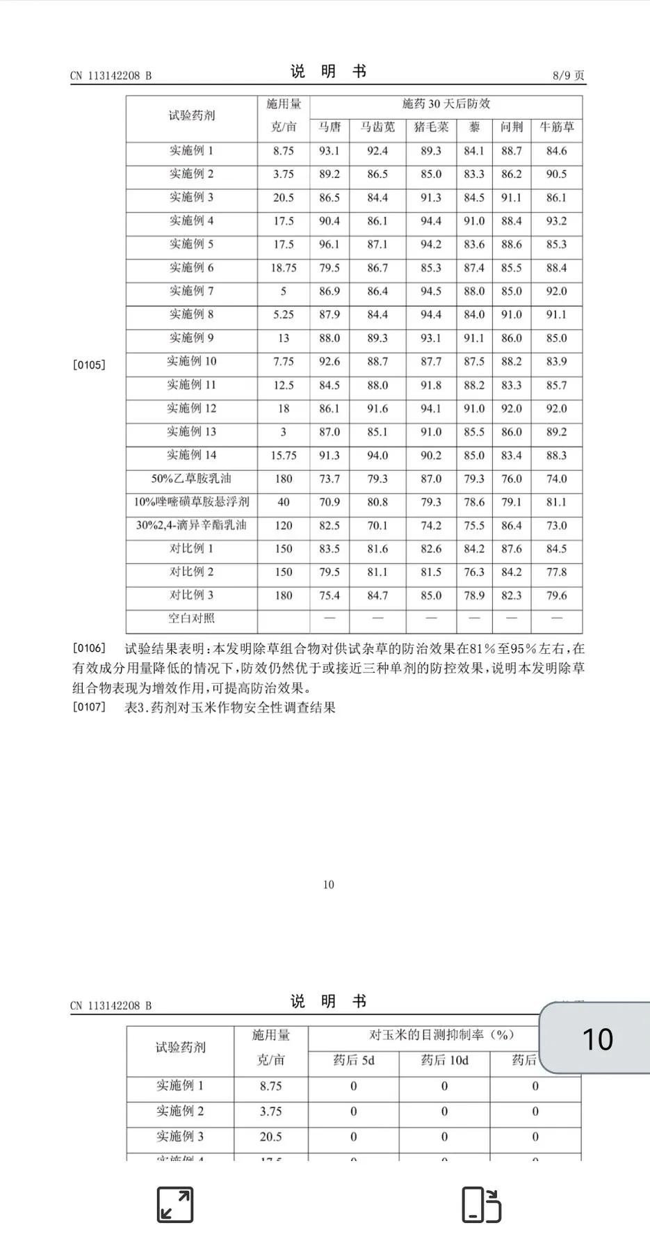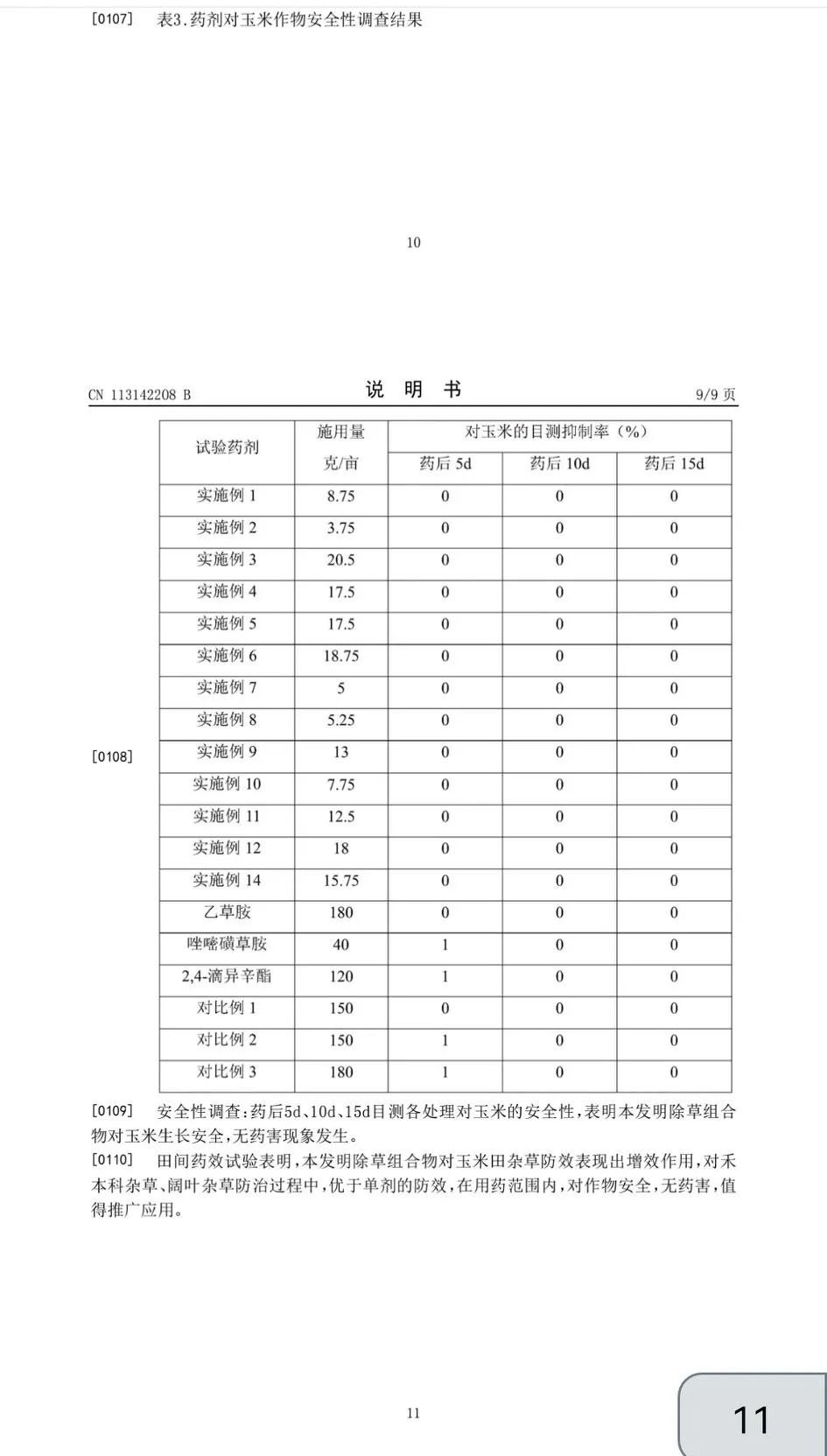 目前现有的复配型除草剂,多数是二元复配型老配方,如果长时间使用,杂草也会对其产生抗药性,使得防效降低。如果加大剂量使用,还可能对玉米产生药害。另外,针对玉米田杂草,现有复配除草剂品种较少,可选择性较小。