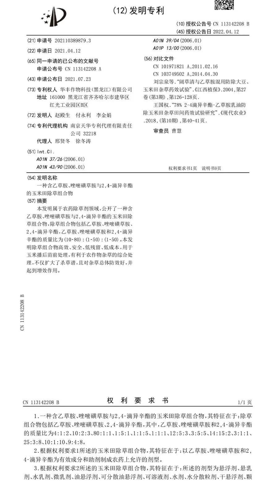 我国是玉米种植与生产大国,播种面积居全球第一,总产量居全球第二。除草一直是玉米种植管理上的难题,目前最有效、经济的手段就是化学除草,但长期连续地使用单一品种或单一作用机理的除草剂会导致杂草耐药性和抗药性不断增强,杂草防除越来越困难。将不同种类的除草剂合理复配或混用能有效的扩大杀草谱,提高防除效果,延续杂草耐药性和抗药性,是解决上述防除问题的最有效的方法之一。