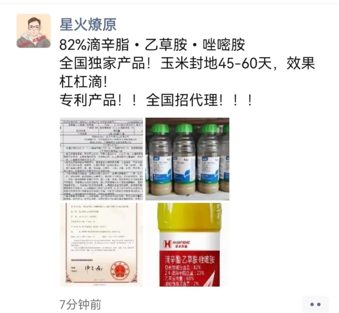 大家好,我是星火燎原9988,最近一段时间在忙别的工作,好久没有更新了。今天跟大家推荐一款国家专利玉米苗前封闭除草剂---82%滴辛脂•乙草胺•唑嘧胺。