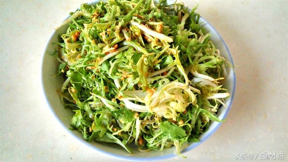 3把调好的汁放入苦菊拌匀,装入盘中,撒上花生米即可。