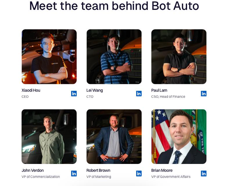 Bot Auto 团队由经验丰富的自动驾驶汽车高管和顶尖工程人才组成,其中,Bot Auto 创始人兼 CEO 侯晓迪博士,于 2015 年以 CTO 身份与陈默、郝佳男联合创立图森未来,曾任图森未来 CTO、董事会主席、总裁、CEO。
