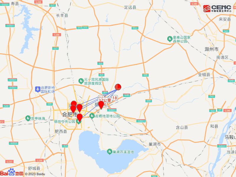 周边县城:震中距肥东县 18 公里、距瑶海区 33 公里、距庐阳区 35 公里、距包河区 36 公里、距蜀山区 37 公里,距合肥市 40 公里。