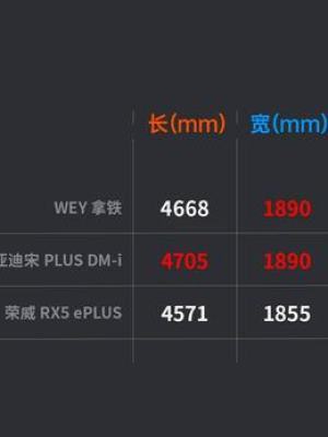 车身尺寸对比了一下同级的比亚迪宋PLUS DM-i 和荣威 RX5 ePLUS,除了车长和轴距外,拿铁的成绩都还不错,并且轴距方面相比宋PLUS DM-i 的差距也不是特别大,但在车长方面拿铁还是短了一点。