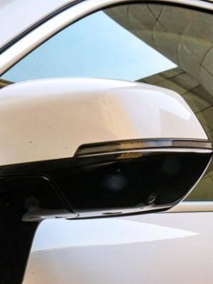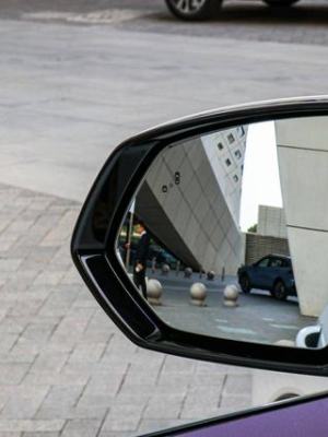 后视镜采用双色设计,并且在功能上集成了转向灯和侧环视镜头,环视镜头支持轮毂模式,在后视镜的左侧还有盲区监测的提醒图标。