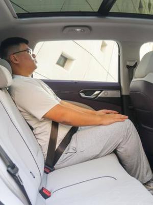 保持前排座椅不动,第二排放在最躺的状态下,后排的头部空间有一拳一指的距离,腿部有两拳的距离;而当第二排座椅调直之后,头部空间还是有一拳多一点的空间,这个表现是非常好的。