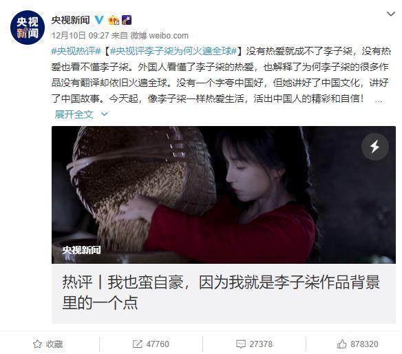 不止是拥有庞大的粉丝群,10日央视新闻都下场点名表扬了李子柒,央视新闻发表评论文章《我也蛮自豪,因为我就是李子柒作品背景里的一个点》,称李子柒的视频“没有一个字夸中国好,但她讲好了中国文化,讲好了中国故事。”