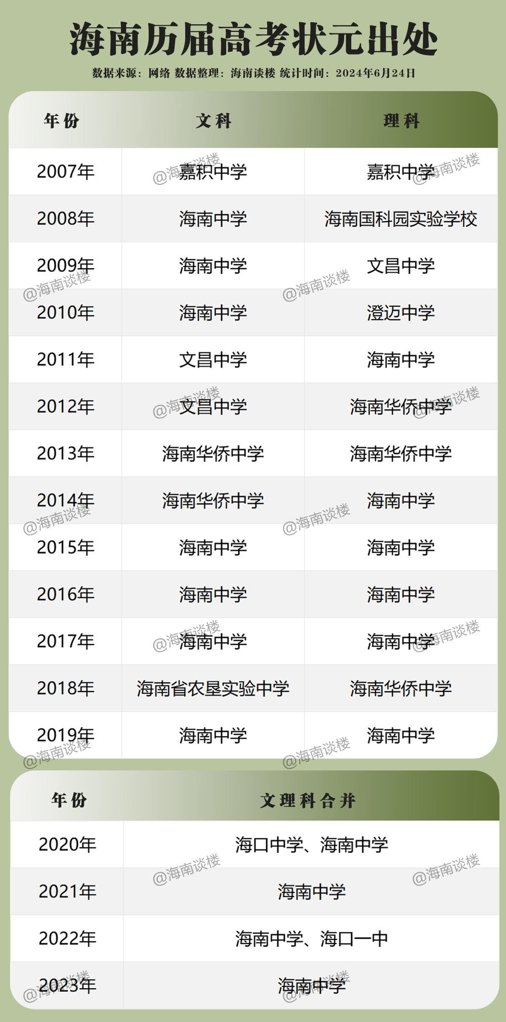 每一年公布成绩的时候,大家最关注的是高考状元出自何处,为此,老谈搜集整理了2007年以来,海南高考状元都来自哪个中学。