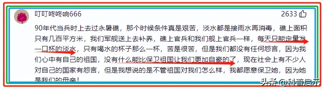 第一批驻扎永暑礁的守礁战士,堪称最苦,没有之一。在刚冒头的礁石上,搭建简单的茅草屋,白天烈日炙烤,晚上海风肆虐,更有身处茫茫大海无尽的恐惧。还要面临淡水及食物资源的短缺。正是这群可敬的人,我国在南沙的布局才能逐渐开展。