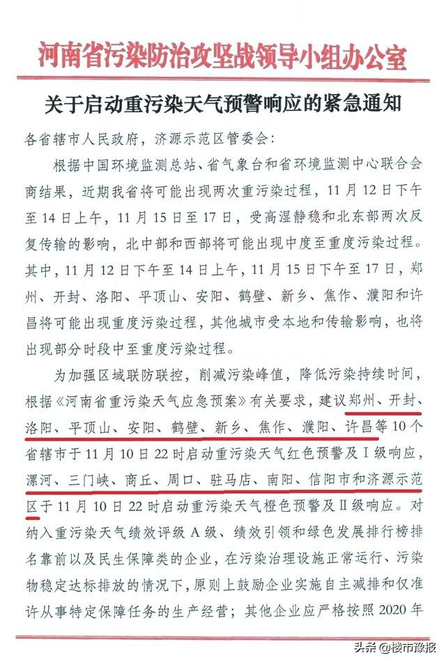 值得一提的是,11月11日,受重污染天气预警响应影响,不止郑州,河南省开封、洛阳、平顶山、安阳、鹤壁、新乡、焦作、濮阳、许昌等10个省辖市于11月10日22时启动重污染天气红色预警及Ⅰ级响应,漯河、三门峡、商丘、周口、驻马店、南阳、信阳市和济源示范区于11月10日22时启动重污染天气橙色预警及Ⅱ级响应。