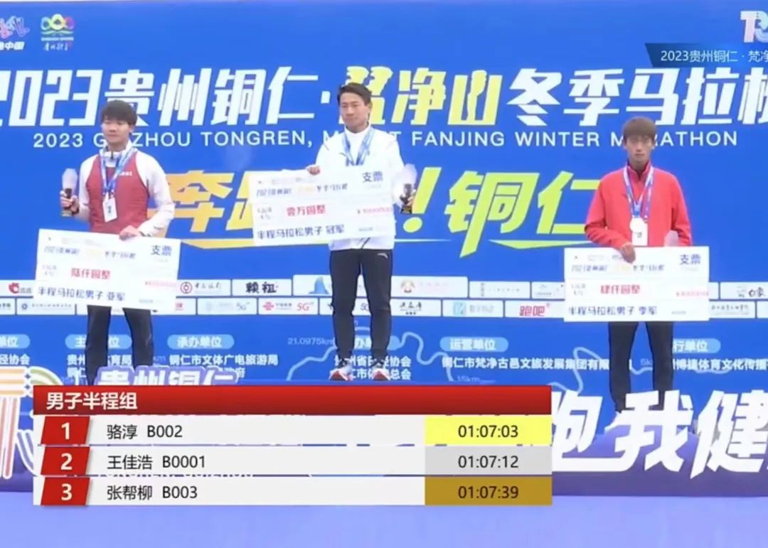 半程马拉松男子冠亚季军分别为骆淳1小时07分03秒、王佳浩1小时07分12秒、张帮柳1小时07分39秒。