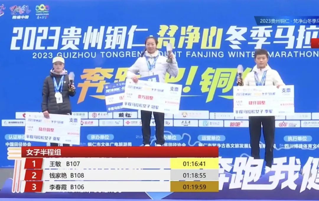 半程马拉松女子冠亚季军分别为王敏1小时16分41秒、钱家艳1小时18分55秒、李春霞1小时19分59秒。