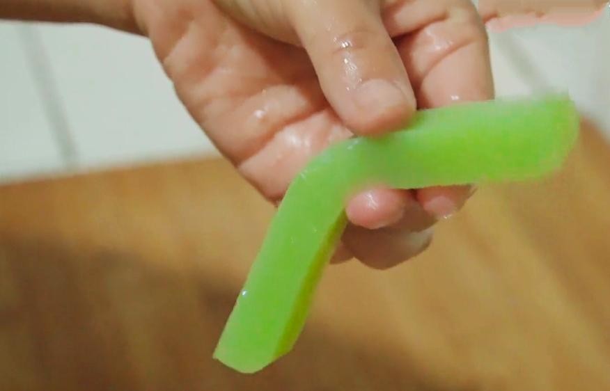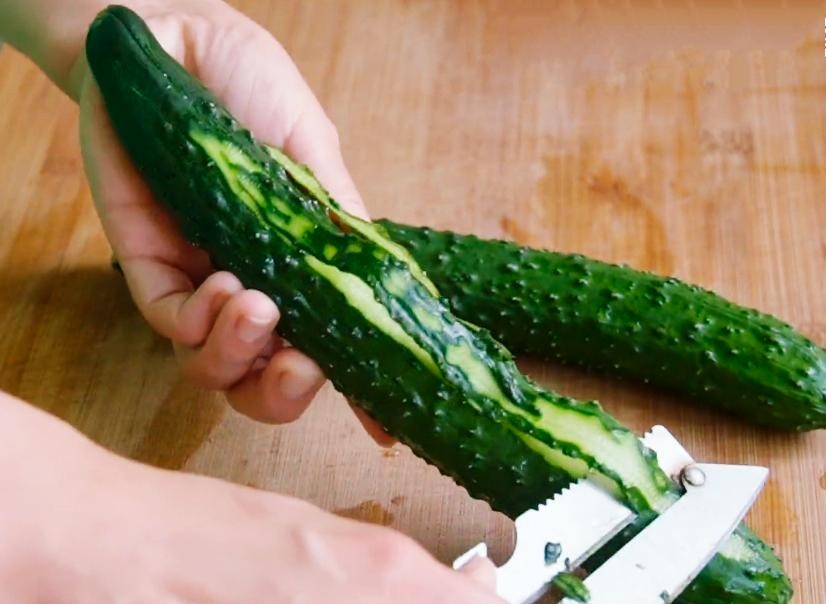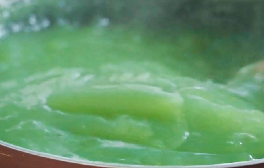 1.将准备好的黄瓜两根洗净,然后我们削掉外皮。这里用到的是黄瓜的外皮,然后放在榨汁器中,加入600ml清水将黄瓜皮榨成汁。(这样做出来凉粉是绿色的,大家也可以选用火龙果做成红色的也可以。)