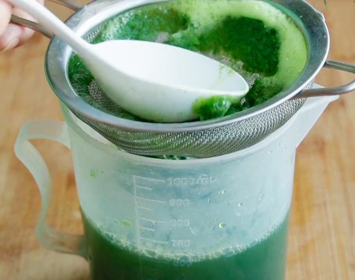 2.榨成汁的黄瓜皮,我们用滤网滤掉黄瓜渣,最后用勺子在上面按压一次,这样能充分过滤黄瓜汁。