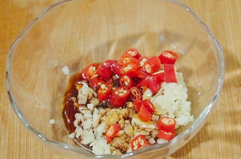 6.三小时后,我们拍一些蒜末,切两三个小米辣,加入半勺蚝油,两勺香醋,加半勺精盐调味,最后再来一勺辣椒油,料汁制作完成。