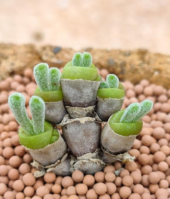 原本短小的耳朵,会突然之间长到五六厘米,很快就变丑了,秋天是它的主要生长季节,番杏科植物也都是在秋天生长的,到了秋季它们会分裂,一分为二,并不是变成两棵,从原来一棵的基础上变成两个侧芽,我家的这一棵大概能有20个侧芽,期间有很多个侧芽也死掉了。