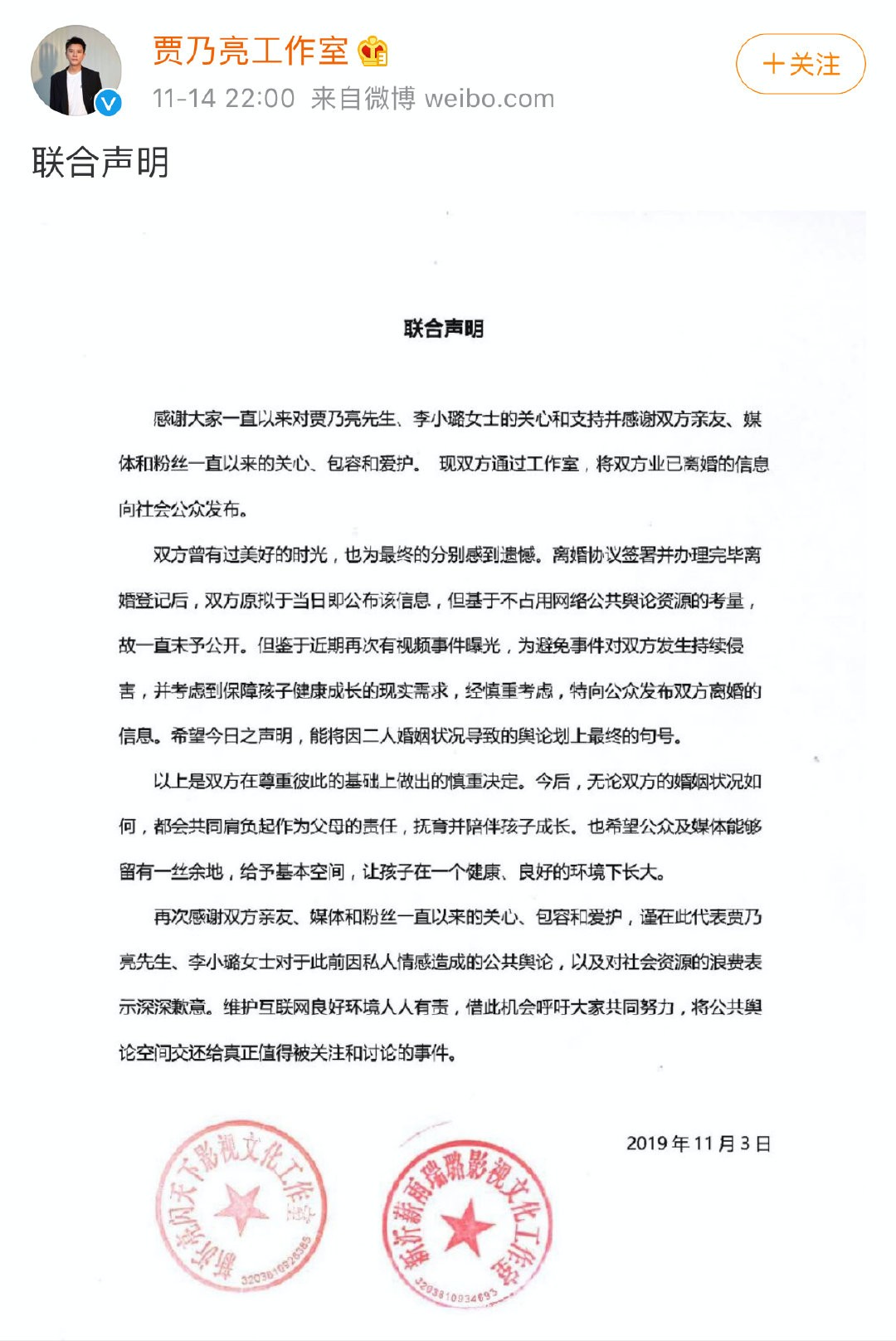 2019年11月14日,李小璐工作室与贾乃亮工作室发表联合声明,二人已经正式离婚,至此故事才有了大结局。