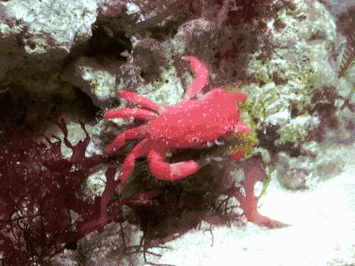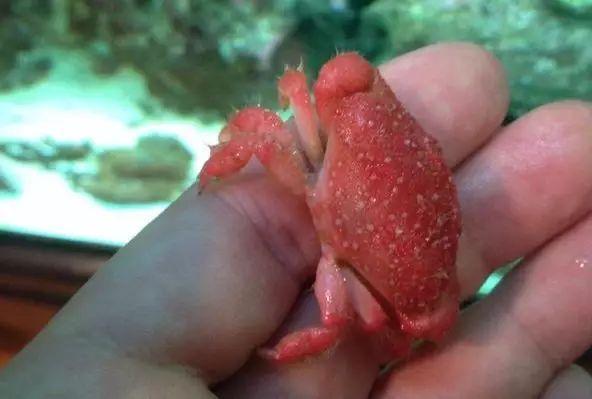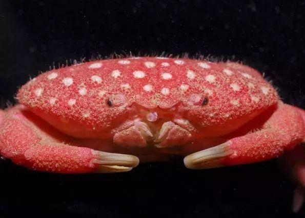 今天的主角草莓是柔毛新花瓣蟹Neoliomera pubescens,俗称“夏威夷草莓蟹”。它们体长只有五厘米左右,外壳呈均匀的亮红色或深粉红色,头胸甲上分布有白色斑点,像极了一颗饱满多汁的大草莓。
