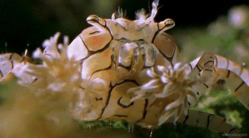 新花瓣蟹还有个俗名叫“红色拳击蟹”,你可能见过的表情包“拳师蟹”或者“啦啦队蟹”就是它的同科亲戚。拳师蟹是扁蟹科细螯蟹属Lybia的成员,这个属里多数物种都有一项脑洞大开的独门绝技,就是会把一对海葵拿在前螯上不停挥舞。为什么它们要如此一本正经地舞动海葵呢?